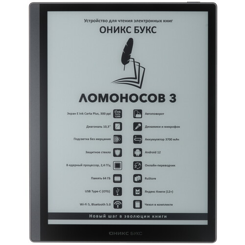 Электронная книга ОНИКС БУКС Ломоносов 3 имеет модуль Wi-Fi, который позволяет читать книги с различных сайтов Интернета. Данные отображаются на 10.3-дюймовом дисплее в разрешении 1860x2480 пикселей. Интегрированная MOON Light 2-подсветка не допускает ощущений усталости в области глаз при слабом внешнем освещении. Электронная книга ОНИКС БУКС Ломоносов 3 в металлическом корпусе оборудована динамиком для воспроизведения аудиокниг. Подзарядка аккумулятора емкостью 3700 мАч осуществляется через разъем USB Type-C. Стекло ONYX Glass не допускает появления царапин и сколов на экране.