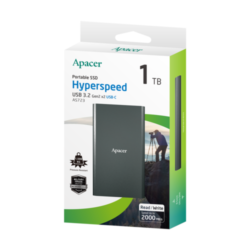 Предназначено для фотографов и видеооператоров, снимающих в сложных условиях. Всего 35,5 г, меньше кредитной карты. AS723 использует интерфейс USB 3.2. Gen2 x2 NVMe со скоростью передачи данных до 2000/2000 МБ/с. Прошли процедуру IV по стандарту MIL-STD-810G 516.6 (испытание на падение при транспортировке). Устойчивость к давлению до 1500 кг. Всего 76% размера кредитной карты.