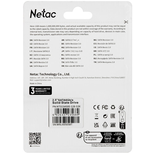 2.5" SATA накопитель Netac SA500 [NT01SA500-128-S3X] вместительностью 128 ГБ подходит для хранения всевозможных мультимедийных файлов и документов, а также для расширения возможностей лэптопа или ПК. Он базируется на памяти структуры 3D NAND. Скорость чтения для устройства составляет 500 МБ/с, записи – 400 МБ/с. Ресурс записи Netac SA500 [NT01SA500-128-S3X] составляет 60 ТБ. Размеры корпуса составляют всего 10х7 см – это значит, что его удобно носить с собой. Показатель ударостойкости накопителя составляет 1500 G – ничего страшного, если он упадет или будет прижат вещами в сумке.