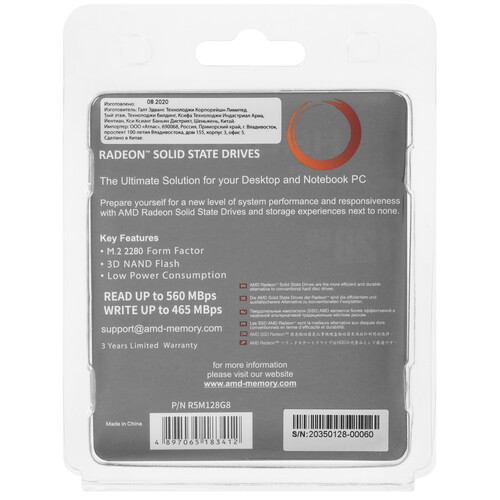 SSD M.2 накопитель AMD Radeon R5 Series [R5M128G8] форм-фактора M.2 способен повысить показатели быстродействия аппаратной платформы ПК. Подключение посредством интерфейса SATA III подчеркивает широкую совместимость запоминающего устройства. Контроллер от Silicon Motion и кэш-память стандарта 3D NAND помогают добиться скорости в режиме последовательного чтения на уровне 542 Мбайт/с. Среди других преимуществ твердотельного накопителя AMD Radeon R5 Series отмечаются экономичное потребление энергии, бесшумная работа и стабильность на протяжении длительной эксплуатации.
