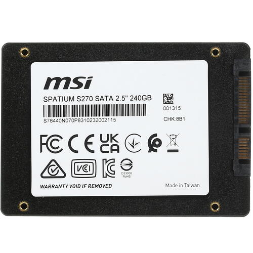 SATA накопитель MSI SPATIUM S270 – универсальное решение для ноутбуков и настольных ПК. Благодаря технологии 3D NAND и скорости до 500 Мбайт/сек в режиме последовательного чтения накопитель обеспечивает повышение производительности аппаратной платформы ПК. Запоминающее устройство объемом 240 ГБ гарантирует надежное хранение большого количества файлов. Подключение к материнской плате выполняется при помощи востребованного интерфейса SATA III. Корпус твердотельного накопителя MSI SPATIUM S270 отличается толщиной 7 мм и ударостойкой конструкцией. Утилита MSI Center позволяет выполнять мониторинг производительности и состояния в режиме реального времени.