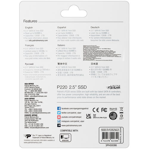 SSD P220 2,5” от Patriot оснащён контроллером SATA III; скорости работы устройства достигают 550 MB/s и 500 MB/s последовательного чтения и записи соответственно. SSD P220 – прекрасный выбор для офисных и домашних компьютеров и ноутбуков. Выпускается в емкостях от 128GB до 2TB и идеально подходит для безопасного хранения файлов и ежедневной продуктивной работы. Диски обеспечены 3х-летней гарантией.