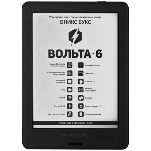 В оснащение электронной книги ОНИКС БУКС Вольта 6 входит 6-дюймовый экран Carta 1200, который обеспечивает на 15% больший контраст и на 20% большую скорость перерисовки в сравнении с предыдущими поколениями дисплеев E Ink. Модель поддерживает режим работы SNOW Field. При его активации не требуется полная перерисовка страниц при чтении простых текстовых документов, при этом заметно снижается количество артефактов при частичной перерисовке. Благодаря подсветке MOON Light 2 с независимой регулировкой цветовой температуры и яркости вы сможете читать в темноте без вреда для зрения. Сенсорный экран электронной книги ОНИКС БУКС Вольта 6 позволит с удобством перелистывать страницы и настраивать работу устройства. Конфигурация модели включает 8-ядерный процессор с тактовой частотой 2 ГГц и 2 ГБ оперативной памяти, благодаря чему обеспечивается стабильная работа с любыми сложными документами. Для хранения файлов предусмотрено 32 ГБ встроенной памяти и слот для карты памяти.