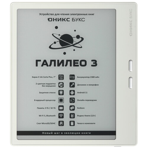 Модель ОНИКС БУКС Галилео 3 может стать оптимальным выбором для тех, кому нужна удобная, лёгкая и функциональная читалка с 7-дюймовым экраном. Это устройство отлично подходит для чтения художественной литературы, но его можно использовать и для просмотра офисных документов, прослушивания аудиокниг и музыки, чтения книг в форматах PDF и DJVU, интернет-серфинга, работы с онлайн-переводчиками и словарями (в том числе прямо в процессе чтения).