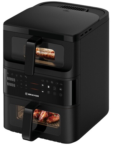 Принцип работы аэрогриля заключается в циркуляции горячего воздушного потока внутри чаши, при этом продукты равномерно готовятся со всех сторон, получаются нежными внутри и с хрустящей корочкой снаружи. Особенность данной модели аэрогриля, это наличие двух чаш для приготовления продуктов, вы можете одновременно приготовить основное блюдо и гарнир.
