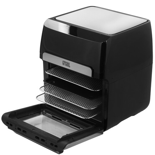 Электрический аэрогриль GFGRIL GFA-9500 - это сочетание универсальности, мощности и экономии времени. Объём 12 литров и мощность 1800 Вт позволяют готовить блюда для всей семьи без использования масла. Модель оснащена 9 программами приготовления: курица, мясо, рыба, картофель, пицца, овощи, выпечка, тосты и рёбрышки. Благодаря функции циркуляции горячего воздуха блюда получаются равномерно пропечёнными и хрустящими. Аэрогриль GFGRIL нагревается быстро и работает стабильно. Диапазон температур от 40 до 200°C. Сенсорная панель управления и дисплей делают использование простым и удобным. Таймер регулируется до 60 минут, есть функция дегидрации до 24 часов.