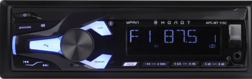 Автомобильное устройство (автомагнитола) УРАЛ МОЛОТ АРС-МТ 115 - головное устройство формата 1 DIN c Bluetooth. Радиоприемники МОЛОТ АРС-МТ 115С (115К) различаются цветами подсветки жидкокристаллического индикатора (ЖКИ) и органов управления. В приемнике МОЛОТ АРС-МТ 115С цвет подсветки синий, в приемнике МОЛОТ АРС-МТ 115К — красный.
