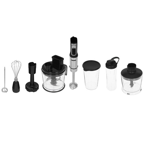 Блендер погружной CADENA BC509MS с 11 насадками, led дисплеем отображающим выбор скорости работы и таймером, сочетает в себе мощность и многофункциональность! Мощность 1500 Вт, позволяет справится с любыми задачами. Плавная регулировка оборотов от 11000 до 15000 в мин. Кнопка Турбо, led подсветка кнопок управления. Специальная конструкция кнопок защищает от случайного включения. Блендер оборудован защитой от блокировки и пререгрева. Уникальная конструкция формы ножей блендера позволяет выполнить задачи максимально эффективно. Основные компоненты выполнены из нержавеющей стали. Шнур питания длинной 1,2 м. Все это делает его отличным помощником на кухне! В комплекте: Насадка блендер, чаша для смешивания с крышкой, чаша измельчитель, венчик для взбивания, насадка для капучино, насадка для приготовления пюре, большая чаша для измельчения - 4 ножа, нарезка кубиками, слайсер, терка, бутылка для приготовления смузи, сменные крышки, одна для приготовления смеси, вторая для употребления готового продукта.