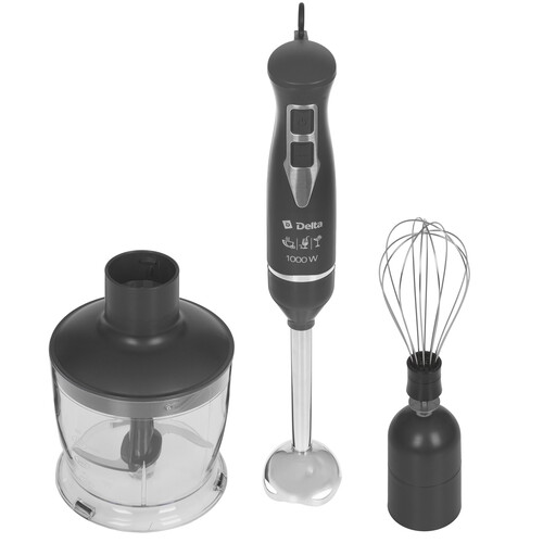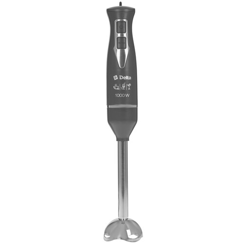 Блендер погружной DELTA DL-7061A серого цвета оснащен тремя насадками. С помощью прибора мощностью 1000 Вт можно взбивать тесто и муссы, измельчать мясо и орехи, перемешивать разные ингредиенты. Модель имеет только одну скорость, но также сможет работать в турборежиме. При его активации кратковременно включается максимальная мощность. Это позволяет обрабатывать твердые продуктов и получать однородные массы. Блендер погружной DELTA оснащен ножами из нержавеющей стали. Они не затупляются и не ржавеют при постоянном контакте с влагой. В комплекте к измельчителю идет емкость объемом 500 мл. Она предотвращает разбрызгивание еды при работе на высоких скоростях. На верхней части блендера есть петля. С ее помощью устройство можно подвесить на крючок над рабочей зоны, чтобы он всегда был под рукой.
