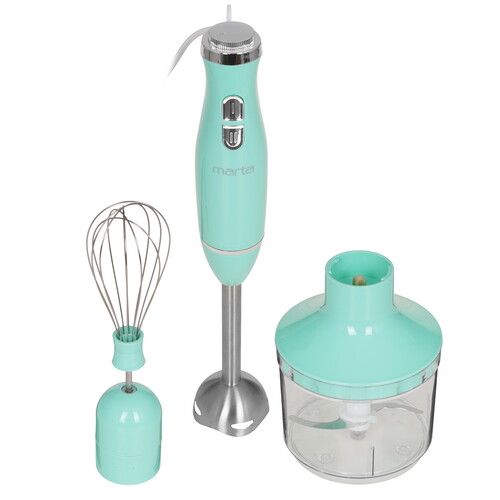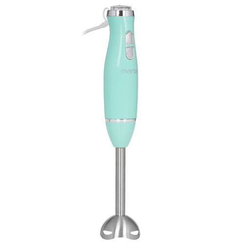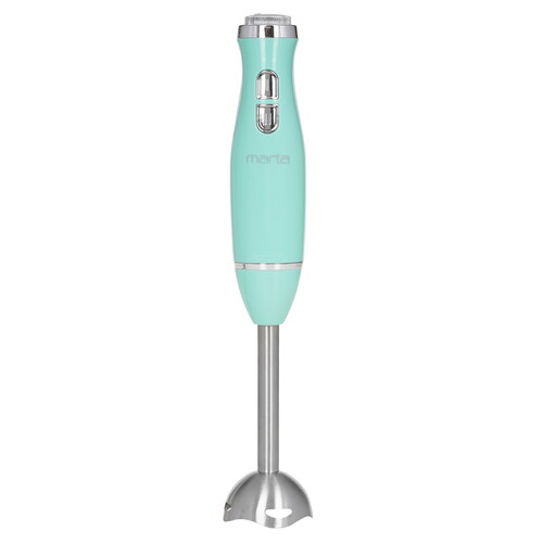 Погружной блендер MARTA MT-1562 в зеленом дизайне подходит для приготовления пюре, супов-кремов без комочков и кремов для выпечки, а ещё может рубить и смешивать. В наборе есть насадки: блендер, венчик и измельчитель. S-образный нож в конструкции подходит для мелкой нарезки фруктов, овощей, рыбы, мяса и сыров. Для измельчителя есть чаша объемом 600 мл. У погружного блендера MARTA MT-1562 два режима скорости, и их можно менять в зависимости от твердости продукта и конкретного рецепта. Скорость регулируется плавно прямо во время работы с помощью кнопок и поворотного механизма на корпусе. Блендер работает от сети через кабель длиной 1.3 м. Для хранения есть петля для подвешивания.