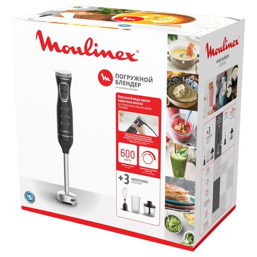 Moulinex DD5R38F0 - погружной блендер мощностью 600 Вт. Удобная регулировка скорости и турборежим превращают прибор в надёжного кухонного помощника. Насадка-блендер отличается острыми лезвиями и защитой от брызг. В комплекте поставляются венчик, измельчитель и мерный стакан.