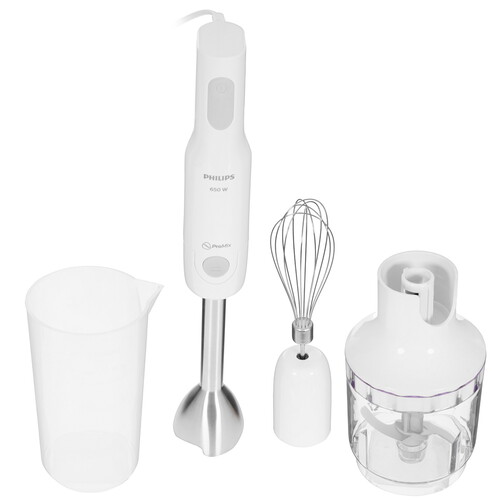 Блендер Philips HR2536/00 мощностью 650 Вт имеет одну универсальную скорость работы, которой достаточно для выполнения любых поставленных задач. Этот прибор имеет все, что необходимо на кухне для готовки повседневных и праздничных блюд. В режиме измельчителя прибор работает с 0.5-литровой пластиковой чашей. В ней вы можете рубить лук, чеснок или другие «ароматные» ингредиенты, не боясь, что руки пропитаются запахом. Венчик для взбивания и блендер используются вместе с 0.5-литровой мерной чашей. Корпус модели выполнен из белого пластика, а погружная часть – из металла. Прочность и вместе с тем легкость – главные достоинства такого сочетания.