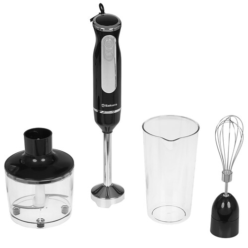 Мощный и тихий DC мотор, 2 скорости работы, острые лезвия из нержавеющей стали, 3 насадки (блендер, венчик, чоппер 0,5л), мерный стакан (0,6 л). Цвет: черный.