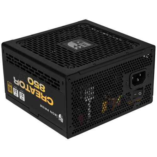Блок питания Iron Pride Creator 850W оснащен тихим вентилятором 12x12 см с автоматической регулировкой оборотов в зависимости от степени нагрева. Набор разъемов упрощает установку БП и подключение к нему процессора, видеокарты и прочей периферии. Активный корректор PFC стабилизирует входное напряжение, устраняет высокочастотные помехи, уменьшает нагревающие провода и прочие компоненты излишки мощности. Сертификация по стандарту 80Plus Gold гарантирует эффективность 90% и выше.