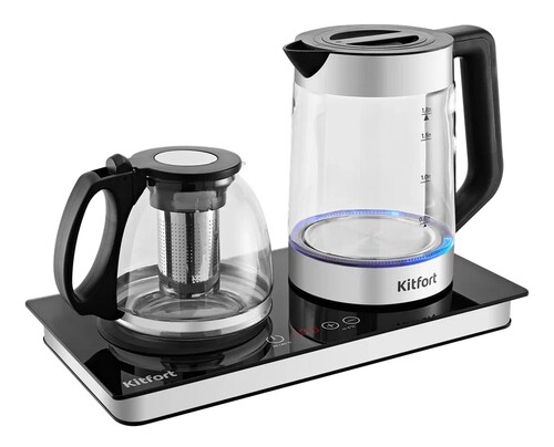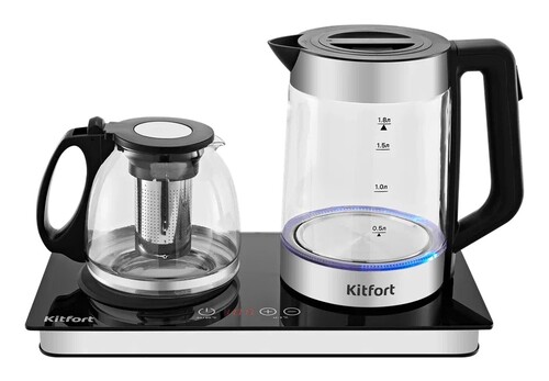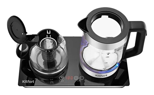 Чайный набор КТ-6650 состоит из чайника ёмкостью 1,8 л, заварочного чайника ёмкостью 1,2 л с фильтром и базы. Чайный набор позволяет не только вскипятить воду, но и заварить чай или кофе в заварочном чайнике. Сенсорная панель управления позволяет выбрать режим работы: «Чай» или «Кофе», выбрать температуру для режимов от 40 до 60 °С с шагом 5 °С и выключить устройство. Во время работы платформы с подогревом отображается установленная температура.