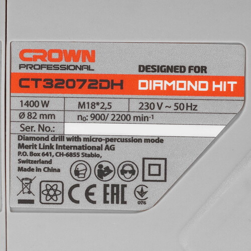 Ручная дрель с микро-ударом Crown CT32072DH BMC разработана специально для работы по технологии Diamond Hit. Предназначена для сухого алмазного сверления отверстий алмазными коронками в бетоне, железобетоне, камне, кирпиче, натуральном камне и в прочих абразивных материалах во время проведения общестроительных работ и так далее.