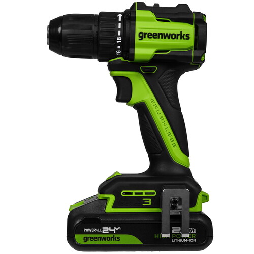 Дрель-шуруповёрт Greenworks DD345 - компактный и производительный инструмент. Ультра компактный - длина корпуса всего 149 мм, за счет конструкции. Лёгкий - всего 0,9 кг без АКБ и 1,5 кг с АКБ 2 Ач. Удобный - с нескользящим покрытием в зоне хвата, с яркой LED-подсветкой рабочей зоны и с поясной клипсой для практичной переноски. Производительный - 27 / 45 Нм макс. мягкий / жесткий крутящий момент для выполнения большинства монтажных работ. Точный - 18+1 ступень настройки моментной муфты для работы с широким диапазоном крепежа. Универсальный - быстрозажимной сверлильный патрон с диапазоном зажима 2,0-13 мм, с фиксатором внешней втулки F-lock. Надежный - обновленный бесщёточный двигатель DigiPro с цифровым управлением и с встроенными системами защиты от перегрузки и от перегрева. Интеллектуальный - инновационная цифровая система Greenworks Intelligent Power управляющая батареей, инструментом и зарядным устройством для долгого срок службы и максимальной производительности.