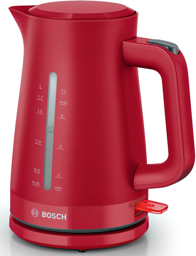 Электрочайник Bosch TWK3M124 представлен в красном корпусе из пластика ABS. Он имеет внутренний объем 1.7 л. Чайник автоматически отключается при снятии с подставки и закипании.