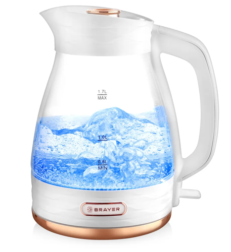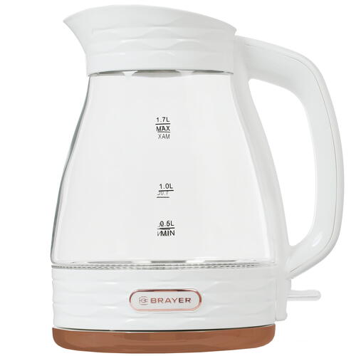 Электрочайник BRAYER BR1029 может похвастаться наличием носика тщательно продуманной формы, внутри которого расположился фильтрующий элемент, незаменимый для тщательной очистки жидкости от накипи, а также иных посторонних примесей. Сверхпрочное стекло, задействованное при создании корпуса, не боится регулярного воздействия высокой температуры, а также сохраняет воду горячей на протяжении длительного времени. Для доступа к 1.7-литровому резервуару электрочайника BRAYER BR1029, достаточно лишь слегка коснуться крышки. Как только вы нажмете на кнопку включения, загорится яркая подсветка, уведомляющая, что прибор приступил к выполнению непосредственных обязанностей. Если в основной емкости не хватает воды, сработает защитная технология, блокирующая его включение. Расположенная на корпусе мерная шкала придется как нельзя кстати, чтобы узнать объем оставшейся жидкости.