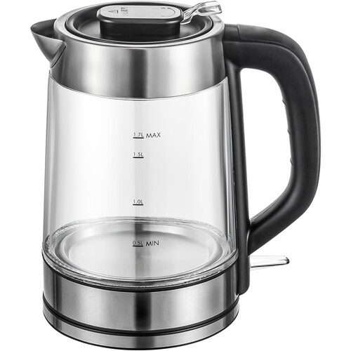 Электрочайник с колбой из стекла и закрытым нагревательным элементом. Корпус вращается на 360 градусов. Автоотключение при закипании защитит устройство от перегрева.