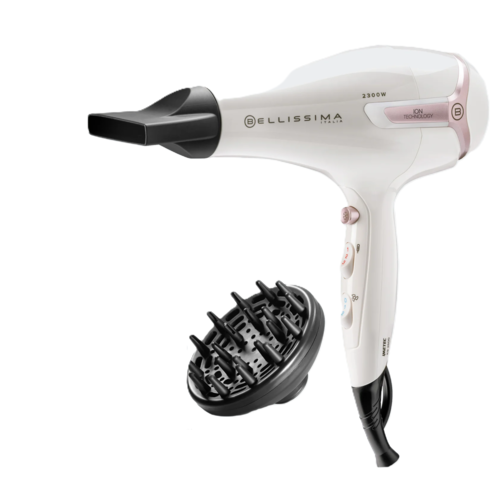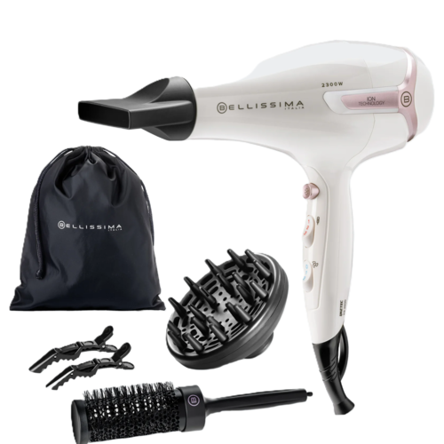 Фен Bellissima K9 2600 оснащен передовой ионной технологией, которая делает волосы мягкими и блестящими. Эта технология предотвращает электризацию. Мощность устройства составляет 2300 Вт, а восемь комбинаций воздушного потока и температуры позволяют создавать разнообразные укладки. Холодный воздух надежно фиксирует результат. В комплекте два аксессуара: прецизионный концентратор для детализированной укладки и профессиональный диффузор для эластичности локонов. Также в наборе два зажима и расческа. Легкий и эргономичный дизайн делает фен удобным в использовании. Чехол защищает устройство и позволяет брать его с собой в поездки.