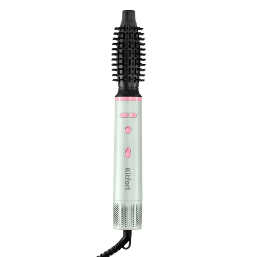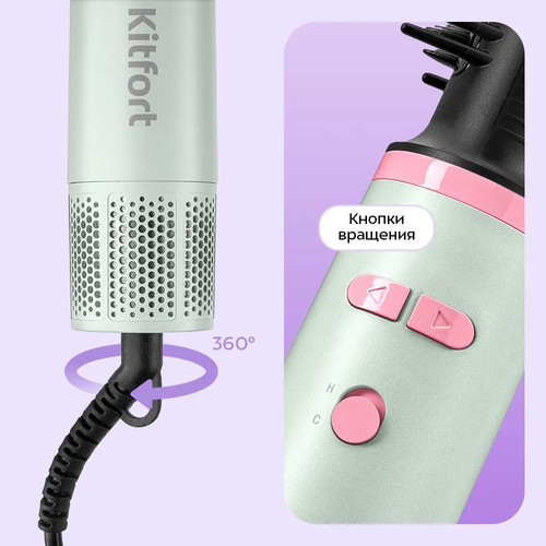 В комплекте 3 насадки. С концентратором поток воздуха становится сильнее и быстро сушит волосы. Расчёска – для создания прикорневого объёма и выпрямления. Вращающаяся насадка – для упругих и аккуратных локонов. Если нужно получить аккуратные и упругие локоны или уложить чёлку, используйте вращающуюся насадку. Внутри неё находится механизм вращения, работающий в режиме высокой температуры. Благодаря кнопкам на корпусе, можно менять сторону вращения.