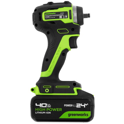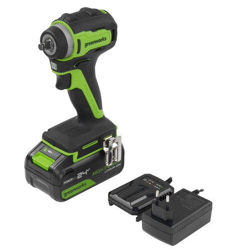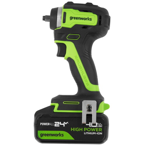 Гайковерт ударный Greenworks G24IW200 (3803607CUB) — компактный инструмент для работ с резьбовым крепежом (гайки, болты) и метизами (винты, саморезы, шурупы) в мастерской или на строительной площадке. Greenworks Intelligent Power – инновационная система контроля и управления батареей, инструментом и зарядным устройством обеспечивающая максимальную производительность и долгий срок службы. Гайковерт оснащен бесщеточным двигателем DigiPro™ дает высокий крутящий момент и долгий срок службы. Прочный корпус из армированного стекловолокном полимера с противоскользящим покрытием имеет длину всего 130 мм. Без аккумулятора инструмент весит 0,9 кг, что делает его легким и удобным в использовании. Квадратный хвостовик 3/8” (9,5 мм) с фрикционным кольцом обеспечивает быструю установку и смену торцевых головок. Инструмент развивает высокую производительность благодаря ударному механизму частотой до 3200 ударов в минуту. Максимальный крутящий момент при затяжке составляет 200 Нм и 280 Нм — при откручивании крепежа. Надежный ударный узел заключен в прочный металлический корпус редуктора. Фронтальная и боковые поверхности инструмента имеют специальное покрытие, повышающее комфорт и надежность хвата. Встроенная светодиодная подсветка (LED) освещает рабочую зону, обеспечивая видимость в условиях недостаточной освещенности. Для удобства переноски предусмотрена практичная поясная клипса.