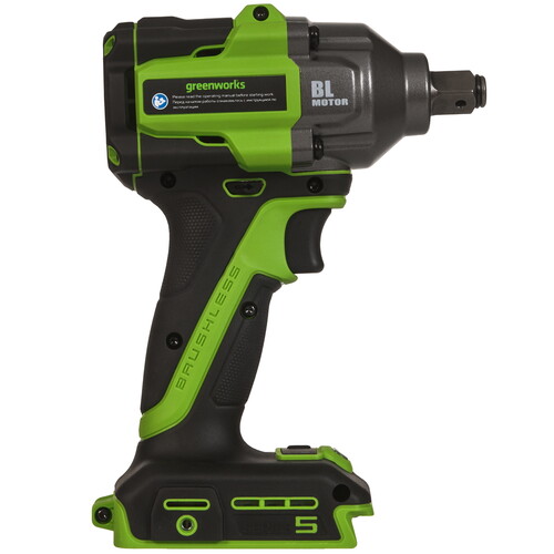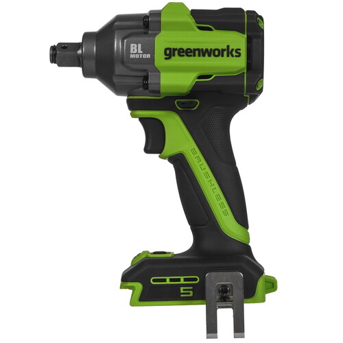 Greenworks IW5500 представляет собой ударный гайковерт, отличающийся компактностью, производительностью и мощностью. Этот инструмент предназначен для быстрого и надежного заворачивания и отворачивания резьбовых соединений (гаек, болтов), а также метизов (винтов, саморезов, шурупов). Его ультракомпактный размер (всего 145 мм длиной) и малый вес (1,25 кг без аккумулятора) делают его удобным для работы в ограниченных пространствах. Корпус инструмента имеет нескользящую поверхность для удобства удерживания, оснащён ярким светодиодом для освещения рабочей зоны и специальной клипсой для крепления на ремне. Благодаря мощному бесщёточному двигателю DigiPro™ устройство эффективно расходует энергию аккумулятора и сохраняет свою силу даже при высоких нагрузках. Максимальный крутящий момент достигает 500 Нм при заворачивании и 650 Нм при откручивании, а интеллектуальная система позволяет выбирать оптимальный уровень усилия среди трёх режимов (350, 400 и 500 Нм), включая специальный режим автоматического обратного хода («Auto-Reverse Stop»). Число оборотов регулируется плавно благодаря простой регулировке на клавише включения. Квадратный хвостовик размером 1/2 дюйма (12,7 мм) оборудован специальным фиксатором, позволяющим быстро менять головки. Ударный механизм тангенциального типа установлен в надежном металлическом корпусе редуктора, защищённом от перегрузок и перегревов. Цифровая система Greenworks Intelligent Power управляет работой увеличивая срок службы и производительность.
