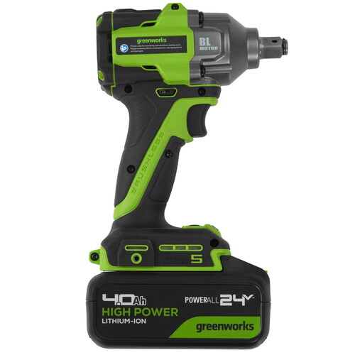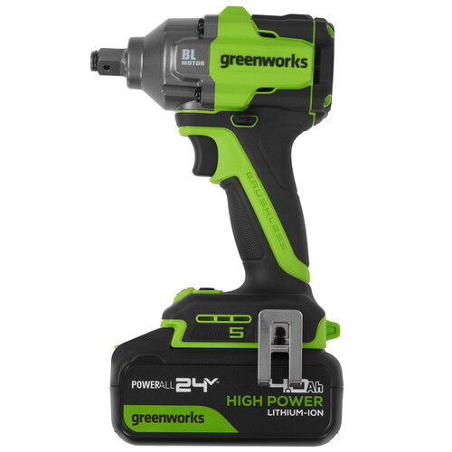 Greenworks IW5500 представляет собой ударный гайковерт, отличающийся компактностью, производительностью и мощностью. Этот инструмент предназначен для быстрого и надежного заворачивания и отворачивания резьбовых соединений (гаек, болтов), а также метизов (винтов, саморезов, шурупов). Его ультракомпактный размер (всего 145 мм длиной) и малый вес (1,25 кг без аккумулятора и 2,05 кг с аккумулятором 4 А·ч) делают его удобным для работы в ограниченных пространствах. Корпус инструмента имеет нескользящую поверхность для удобства удерживания, оснащён ярким светодиодом для освещения рабочей зоны и специальной клипсой для крепления на ремне. Благодаря мощному бесщёточному двигателю DigiPro™ устройство эффективно расходует энергию аккумулятора и сохраняет свою силу даже при высоких нагрузках. Максимальный крутящий момент достигает 500 Нм при заворачивании и 650 Нм при откручивании, а интеллектуальная система позволяет выбирать оптимальный уровень усилия среди трёх режимов (350, 400 и 500 Нм), включая специальный режим автоматического обратного хода («Auto-Reverse Stop»). Число оборотов регулируется плавно благодаря простой регулировке на клавише включения. Квадратный хвостовик размером 1/2 дюйма (12,7 мм) оборудован специальным фиксатором, позволяющим быстро менять головки. Ударный механизм тангенциального типа установлен в надежном металлическом корпусе редуктора, защищённом от перегрузок и перегревов. Цифровая система Greenworks Intelligent Power управляет работой аккумулятора, инструмента и зарядного устройства, увеличивая срок службы и производительность.