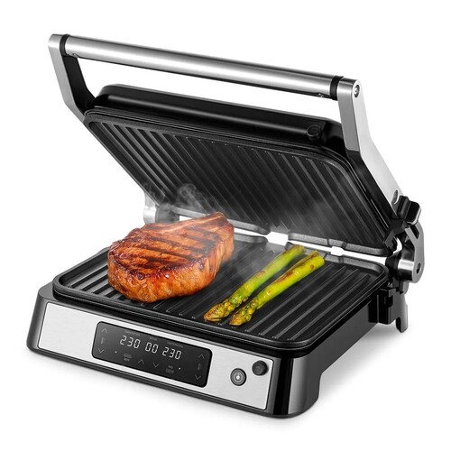 Электрогриль КТ-4676 предназначен для приготовления мяса, рыбы, овощей, сосисок, бутербродов, панини, сэндвичей, гренок, тостов и многих других блюд. Высокая температура панелей способствует быстрому приготовлению продуктов. У КТ-4677 есть 2 режима приготовления — односторонний и двусторонний. В двустороннем режиме продукты помещаются между двумя нагреваемыми панелями и обжариваются равномерно с двух сторон. Это сокращает время готовки и не требует переворачивания еды. В одностороннем режиме приготовления крышка гриля откидывается на 180° при помощи кнопки, благодаря чему гриль превращается в большую жаровню, а продукты можно выложить сразу на две панели. Сенсорная панель управления позволяет задавать температуру для каждой панели отдельно — от 60 до 230 °C с шагом 10 °C, а также установить таймер до 60 минут с шагом 1 минута. Удобно при приготовлении разных продуктов одновременно. Съёмные панели с ребристой поверхностью облегчают чистку после приготовления. Антипригарное покрытие позволяет готовить с минимальным количеством масла. Фиксатор закрепляет крышку в закрытом или приоткрытом положении — удобно при переноске. В процессе приготовления продуктов образуются жир и сок, которые стекают в поддон для сбора жира. Просто выньте поддон и помойте его с моющим средством. Ваша кухня останется чистой!