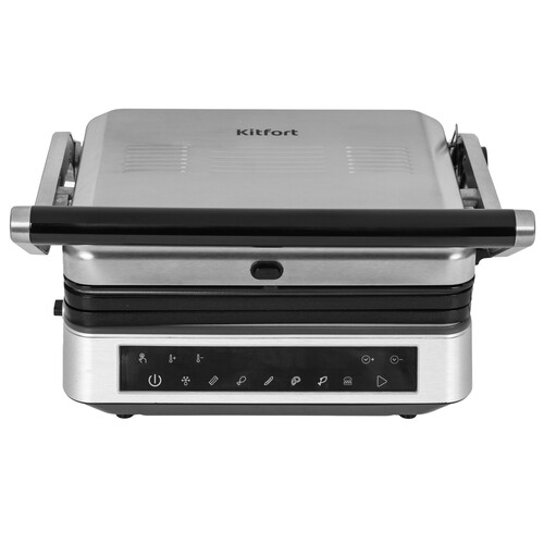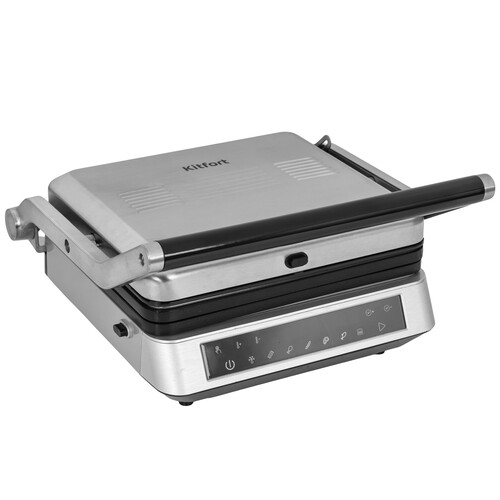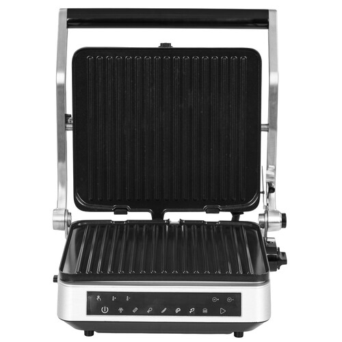 Электрогриль предназначен для приготовления мяса, овощей, бутербродов, тостов и многих других блюд. Нагрев панелей – прямой. Конструкция позволяет готовить в двух режимах: двустороннем и одностороннем. Крышка гриля откидывается на 180°. Электрогриль оснащён сенсорной панелью управления. С её помощью можно легко выбрать любую из 7 программ. Программы отличаются температурой и временем приготовления. Панели электрогриля съёмные. Это облегчает чистку и обслуживание прибора. Благодаря такой конструкции, вы сможете легко удалить остатки пищи после использования. На панели нанесено антипригарное покрытие. Это позволяет готовить с минимальным количеством масла. Такое покрытие также облегчает очищение панелей. На корпусе гриля есть специальный регулятор, который позволяет фиксировать крышку в приподнятом положении. Это облегчает приготовление продуктов разного размера.