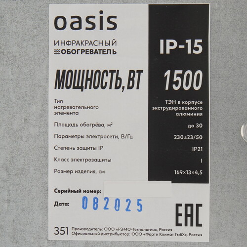 Инфракрасный обогреватель Oasis – это эффективный электронагревательный прибор, который обеспечивает комфортную температуру за счёт инфракрасного излучения. В отличие от традиционных обогревателей, электрический инфракрасный обогреватель не передаёт тепло воздуху напрямую, а точечно нагревает предметы, стены или пол. Поверхности аккумулируют тепло и равномерно согревают пространство. Благодаря компактным размерам и лаконичному дизайну, обогревательный прибор не выделяется из интерьера и занимает минимум места. Благодаря точечному нагреву и компактности, инфракрасный обогреватель Oasis — это идеальный отопительный прибор для локального обогрева на открытых пространствах, таких как терраса или беседка.