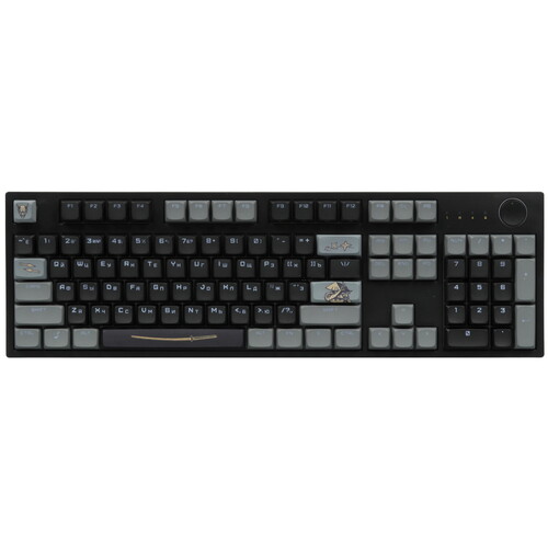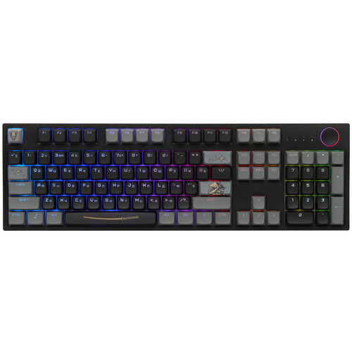 ARDOR GAMING Katana V2 — полноразмерная игровая клавиатура с раскладкой ANSI (104 клавиши) и переключателями ARDOR Plum, рассчитанными на ресурс до 80 млн нажатий. Подключается по USB и поддерживает RGB‑подсветку, NKRO, шумоизоляцию корпуса, колесо прокрутки и программируемые клавиши, а в комплекте идут дополнительные кейкапы, переключатели и двойной пуллер.