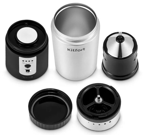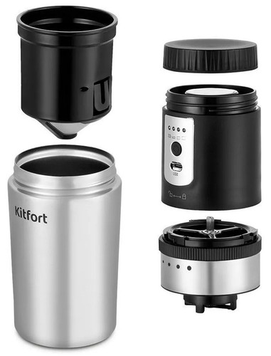 Портативная кофемолка «3 в 1» KT-7536 совмещает в себе функцию не только кофемолки, но и капельной кофеварки, а также позволяет брать кофе с собой в термокружке. Кофемолка является автоматической и оснащена коническими жерновами из керамики.
