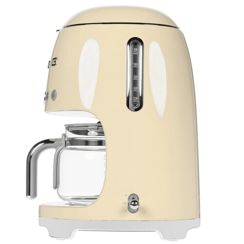 Кофеварка капельная SMEG DCF02CREU выполнена в привлекательном корпусе бежевого цвета и оснащена кнопочным управлением. Функция регулировки жесткости воды позволяет готовить вкусный кофе с насыщенным ароматом. Также в данной модели имеется функция выбора крепости кофе. Емкость для напитка выполнена из прозрачного ударопрочного стекла и обладает объемом 1.4 л. Режим поддержания тепла способен сохранять температуру приготовленного напитка в течение 40 минут. Среди других особенностей SMEG DCF02CREU отмечаются таймер, автоматическая декальцинация и противокапельная система.