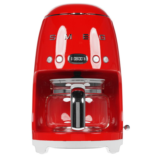 Кофеварка капельная SMEG DCF02RDEU выполнена в компактном корпусе насыщенного красного цвета и обеспечивает качественное приготовление напитка из молотого кофе. Кофейник изготовлен из прочного прозрачного стекла и обладает емкостью 1.25 л. Плита автоматического подогрева помогает поддерживать температуру напитка в течение 40 минут. Панель управления с кнопками и дисплеем отличается простотой выбора параметров. К функциональным особенностям данной модели относятся возможность регулировки крепости напитка и порции. Из других характеристик SMEG DCF02RDEU отмечаются система автоматической декальцинации, таймер и противокапельная система.