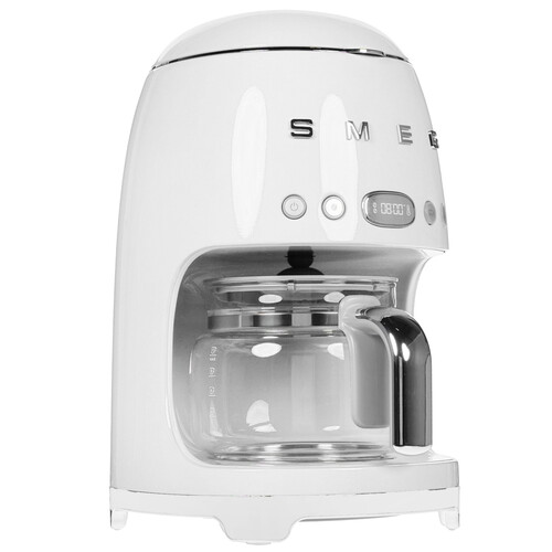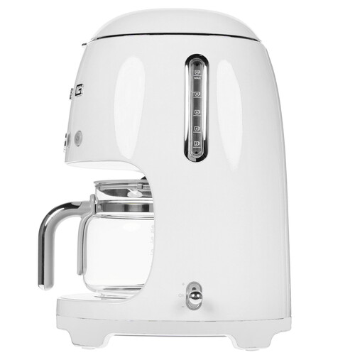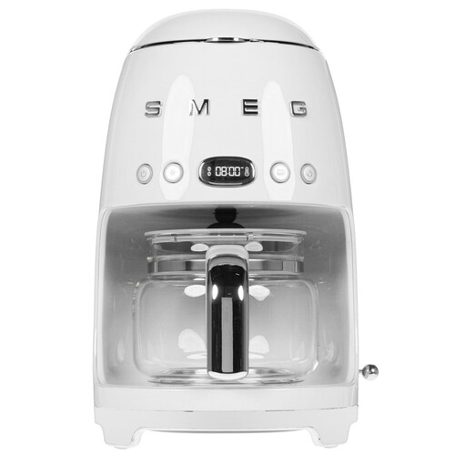 Кофеварка капельная SMEG DCF02WHEU сочетает стильный дизайн, функциональность и надежность. На передней панели расположены кнопки управления и информативный цифровой дисплей с таймером. Кофейник изготовлен из прочного прозрачного стекла и обладает емкостью 1.25 л. В нижней части расположена плита автоматического подогрева, поддерживающая температуру приготовленного напитка на протяжении 40 минут. К функциональным особенностям SMEG DCF02WHEU относятся регулировка крепости и порции напитка. Система автоматической декальцинации помогает продлить срок службы техники. Также отмечается противокапельная система.