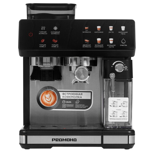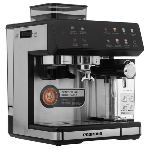 Кофеварка рожковая РЕДМОНД CM738 в черном корпусе использует зерновой и молотый кофе. Модель с мощностью 1350 Вт производит приготовление 6 видов напитков – двойной капучино, двойной латте, двойной эспрессо, капучино, латте и эспрессо. Объем резервуара для воды составляет 2.6 л.