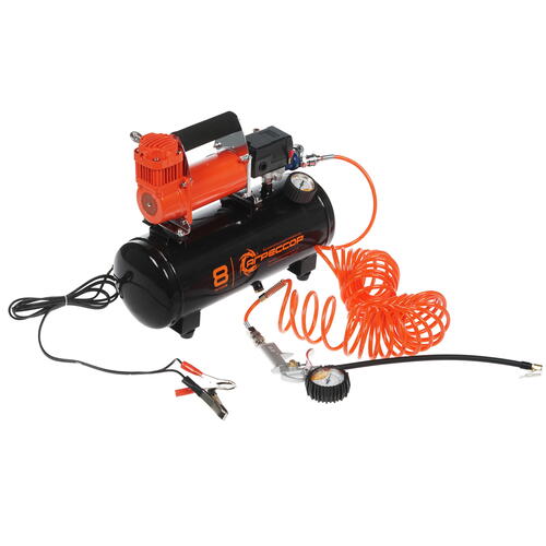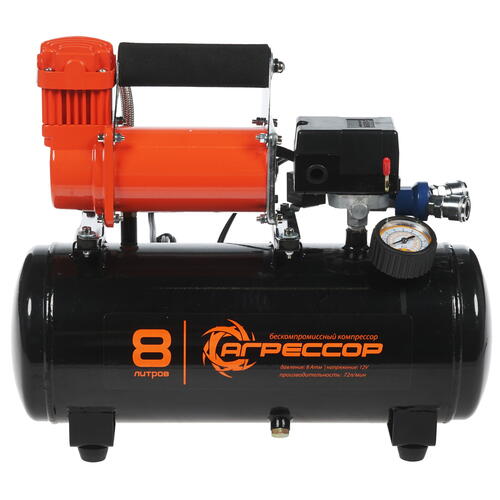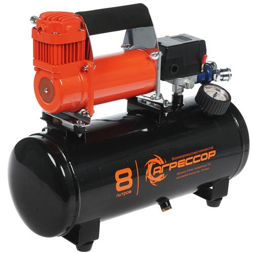 Компрессор для шин АГРЕССОР AGR-8LT предоставляет нужное количество сжатого воздуха для накачки автомобильных шин или работы пневматических инструментов. Преимуществом этой модели является работа от автомобильного аккумулятора с выходным напряжением 12 В. При помощи 2.4-метрового кабеля питания с зажимами вам не составит труда подключить компрессор непосредственно к клеммам АКБ. Рассчитанный на непрерывную работу в течение 30 минут портативный компрессор может создавать давление до 8 атмосфер. В конструкции воздушного компрессора АГРЕССОР AGR-8LT предусмотрен накопительный бак-ресивер, объем которого составляет 8 литров. Устройство оснащается спиральным воздушным шлангом длиной 10 метров, на котором расположен пневмопистолет для накачки шин. Пистолет оборудован аналоговым манометром со шкалой, размеченной в AT и PSI (lb/m²). Благодаря манометру вы сможете в любой момент узнать текущее давление в шине.