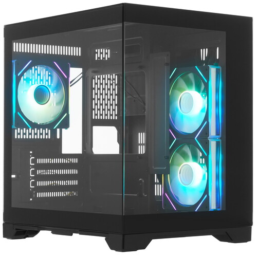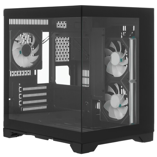 Корпус 1STPLAYER MEGAVIEW MV5-TP ARGB черного цвета в форм-факторе Mini-Tower подходит для сборки ПК на платформах Micro-ATX, Mini-ITX. Модель идет с 3 вентиляторами: 2 спереди и 1 сзади для быстрого отвода тепла. Сетчатая передняя панель обеспечивает эффективный продув. На передней панели устройства есть USB 3.1, USB 2.0, аудио разъемы и кнопки управления. Для эстетики предусмотрена ARGB подсветка вентиляторов и боковая стеклянная панель.
