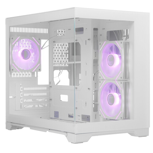Корпус 1STPLAYER MEGAVIEW MV6-TP ARGB белого цвета в форм-факторе Mini-Tower подходит для сборки ПК на платформах Micro-ATX, Mini-ITX. Модель идет с 3 вентиляторами: 2 спереди и 1 сзади для быстрого отвода тепла. Сетчатая передняя панель обеспечивает эффективный продув. На передней панели устройства есть USB 3.1, USB 2.0, аудио разъемы и кнопки управления. Для эстетики предусмотрена ARGB подсветка вентиляторов и боковая стеклянная панель.