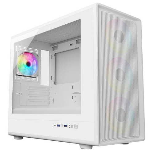 Корпус ARDOR GAMING Rare MS5 представлен в типоразмере Mini-Tower. Внутреннее пространство предусматривает размещение материнской платы Micro-ATX или Mini-ITX, графического адаптера длиной до 420 мм, источника питания длиной не более 240 мм. Два отсека 2.5 дюйма и 1 отсек 3.5 дюйма предоставляют возможность создания вместительного хранилища файлов с помощью накопителей HDD и SSD. Корпус оборудован четырьмя вентиляторами с настраиваемой подсветкой ARGB и поддержкой функции синхронизации освещения. На верхней панели допускается монтаж жидкостного кулера длиной до 360 мм. Корпус ARDOR GAMING Rare MS5 выполнен в белом цвете. Прозрачное окно из закаленного стекла на левой стороне открывает обзор на аппаратные компоненты игрового компьютера. Фронтальная панель представлена в виде пластиковой решетки. Укладка кабелей за задней стенкой улучшает вентиляцию воздуха и делает удобной организацию пространства. Фильтр защищает от проникновения пыли внутрь корпуса. На левой панели расположены 2 порта USB Type-A, симметричный порт USB Type-C и аудиоразъем 3.5 мм для подключения гарнитуры, внешних накопителей и других устройств.