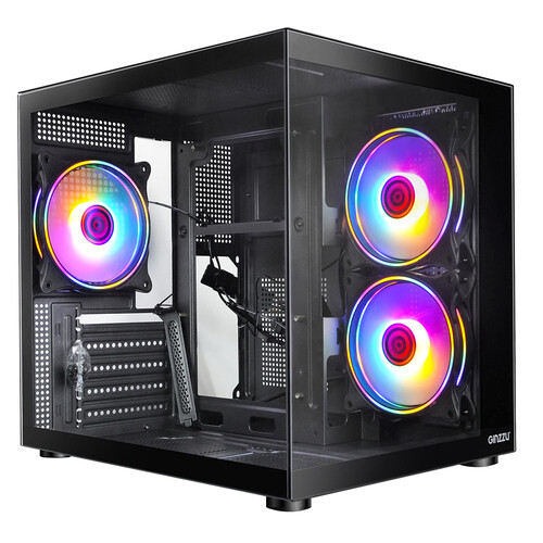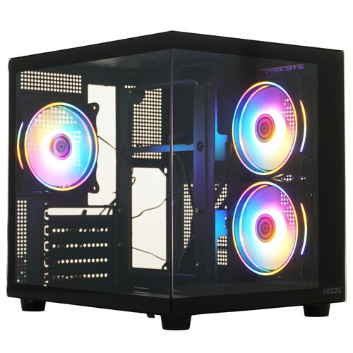 Корпус Ginzzu V150 REV1 черного цвета в форм-факторе Mini-Tower подходит для сборки игровых ПК на платформах Micro-ATX, Mini-ITX. Модель идет с 3 вентиляторами для быстрого отвода тепла. На корпусе устройства есть USB 3.1, USB 2.0, аудио разъемы и кнопки управления. Возможна прокладка кабелей за задней стенкой. С помощью многоцветной FRGB-подсветки можно создавать разные визуальные эффекты.
