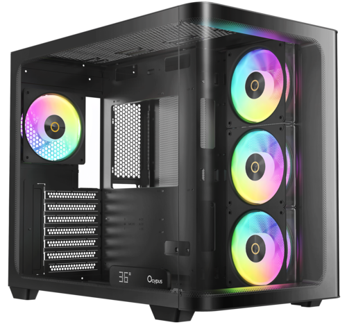 В Ocypus буква «О» означает больше, чем просто название — она отражает то, как вы владеете своей сборкой, наблюдаете за ней и оптимизируете её. Панорамное изогнутое стекло Iota C70 Curve позволяет вам подчеркнуть свой стиль, демонстрируя каждый компонент и каждый индикатор. Встроенный цифровой дисплей позволяет в режиме реального времени отслеживать температуру процессора и видеокарты. А благодаря органическому узору в виде капель дождя, выгравированному на стекле, даже мельчайшие детали оживят вашу сборку.