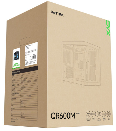 XASTRA QR600M корпус - аквариум с двумя панелями из закаленного стекла с идеальной прозрачностью. Поддерживает установку до 9 вентиляторов, на верхней панели есть возможность установки вентиляторов 2 х 140 мм или 3 х 120 мм. СЖО 360 мм можно поставить сверху или снизу; максимальная высота башенного кулера - 160 мм. Длина видеокарты до 445 мм. Поддержка материнских плат: M-ATX, ITX. Оснащен магнитными фильтрами.