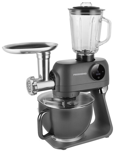 Кухонная машина РЕДМОНД FM615 — универсальное устройство 4 в 1 для приготовления блюд на завтрак, обед и ужин. Оснащена встроенной мясорубкой, блендером, овощерезкой, также работает как планетарный миксер. В комплекте к мясорубке идут 3 перфорированных диска для приготовления фарша и 2 насадки для колбасок, к овощерезке — 3 вида терок; также съемный блендер и 3 насадки для взбивания и смешивания.