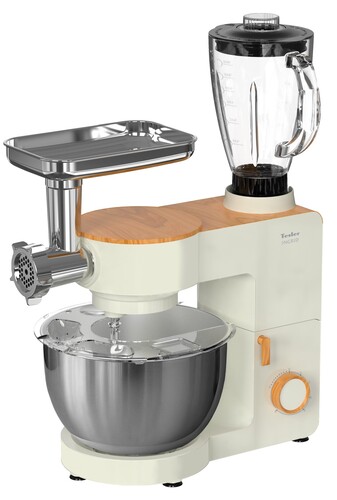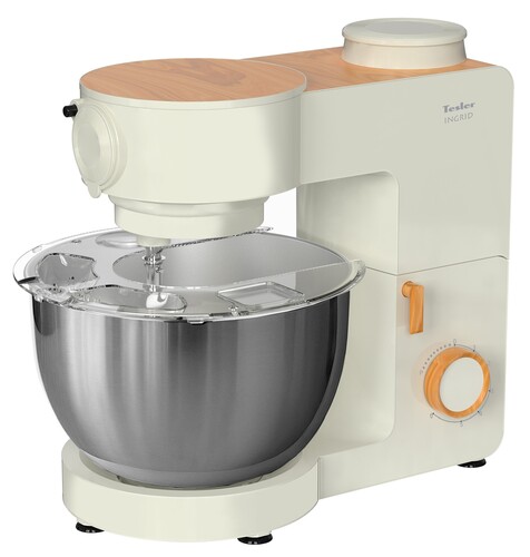 Tesler KM-1640 — мощная и многофункциональная кухонная машина, совмещающая планетарный миксер, блендер и мясорубку. Планетарная система смешивания обеспечивает равномерную обработку ингредиентов: насадки вращаются одновременно вокруг своей оси и по окружности чаши. Вместительная чаша из нержавеющей стали на 6 литров позволяет замешивать большие объёмы продуктов. Максимальная скорость — до 210 оборотов в минуту. Блендер оснащён отдельной чашей из закалённого стекла объёмом 1,5 литра с острыми ножами из нержавеющей стали. Он легко справляется с льдом, орехами и твёрдыми овощами. Доступны шесть скоростей и импульсный режим для точного контроля консистенции смузи, соусов и детского питания. Максимальная скорость — 18 000 об/мин. Крышка оснащена отверстием для добавления ингредиентов во время работы. Мясорубка оборудована мощным шнеком и стальными ножами, подходящими для мяса любой жирности. Скорость вращения — до 210 об/мин, производительность — до 2 кг фарша в минуту. Металлический лоток более гигиеничен и долговечен по сравнению с пластиковыми изделиями. Съёмные элементы упрощают очистку. Двигатель с медной обмоткой и мощностью до 1900 Вт, обеспечивает стабильную работу даже при высокой нагрузке. Цельнометаллический редуктор надёжен и тих в работе, легко справляется с замесом густого теста. Встроенная защита от перегрева автоматически регулирует нагрузку и предотвращает перегрузки. Конструкция машины продумана для удобства: простое управление и лёгкая очистка. Корпус с матовой поверхностью бежевого цвета с декоративными вставками под дерево гармонично впишется в интерьер практически любой кухни. Силиконовые ножки обеспечат устойчивость машины даже при долгой работе на максимальных оборотах.