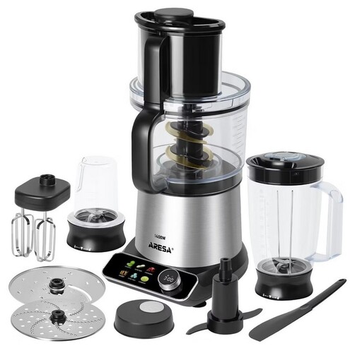 Кухонный комбайн Aresa AR-1716 — многофункциональный прибор, способный заменить несколько отдельных устройств. Основой является мощный мотор и комплект разнообразных насадок для обработки продуктов. Управление комбайном осуществляется комбинировано: выбор скорости — электронный, с отображением параметров на дисплее, активация основных функций — с помощью механических переключателей. Конструкция ножей и мощность мотора позволяют измельчать лед для коктейлей. Мощность 1400 Вт.
