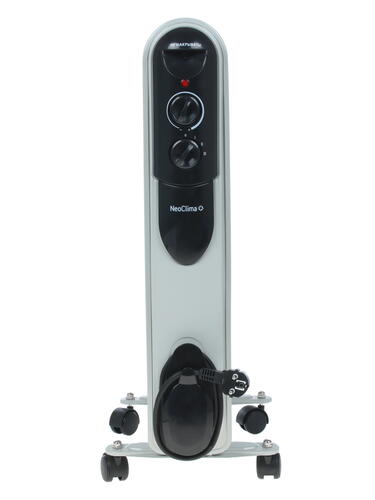 Масляный радиатор Neoclima NC 9311 обеспечит всей семье комфортные климатические условия в помещении в холодное время года. Если система отопления в вашем доме не справляется с нагревом комнат, приобретайте представленное устройство. За счет высокой мощности 2500 Вт оно без труда справится с обогревом помещений площадью до 25 м². Встроенный регулятор мощности и термостат позволят вам установить наиболее оптимальные для вас параметры работы техники и комфортную температуру нагрева. Конструкция прибора предусматривает 11 секций. Масляный радиатор Neoclima NC 9311 питается от электросети с напряжением 220/230 В через сетевой шнур, длина которого равняется 1.5 м. Защищенному корпусу не страшна влага, благодаря чему использовать этот прибор можно в помещениях с высоким уровнем влажности. Для комфортного перемещения устройства из одной комнаты в другую оно оборудовано колесиками и эргономичной ручкой. Предусматривается напольная установка масляного радиатора. В корпусе прибора имеется отсек для хранения сетевого шнура.