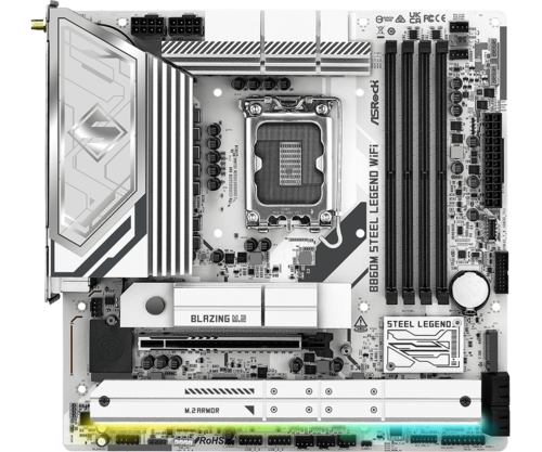 Материнская плата ASRock B860M Steel Legend WiFi – устройство форм-фактора Micro-ATX с размерами 244x244 мм подходит для сборки мощного универсального компьютера для дома или офиса. Плата работает под управлением чипсета Intel B860 и поддерживает Intel Core Ultra (серия 2). Схема питания 12+1+1+1+1 гарантирует реализацию потенциала мощных игровых CPU, а подсистема памяти с поддержкой технологий разгона XMP 3.0 обеспечивает стабильность работы модулей DDR5. Максимальный объем ОЗУ равен 256 ГБ.